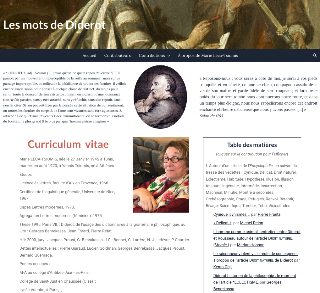 Sans exhaustivité ni protocole, on trouvera donc sur ce site une liste de mots de Diderot et de déclarations à Marie Leca-Tsiomis qui visent à prouver la fécondité d'une approche privilégiant le plaisir de l'écoute des mots, de leur portée et de leur valeur. La parole de chercheuse de Marie Leca-Tsiomis a suscité nombre d'amitiés intellectuelles qui ont composé un bouquet d'hommages, sous des formes diverses, dont seule une publication numérique pouvait rendre compte. Nous sommes heureux de pouvoir les donner à savourer à un public plus large. Porte d'entrée dérobée à l'anonymat, le site ouvre sur une navigation plus savante pour qui le veut, en invitant à explorer l'univers de l'Encyclopédie.