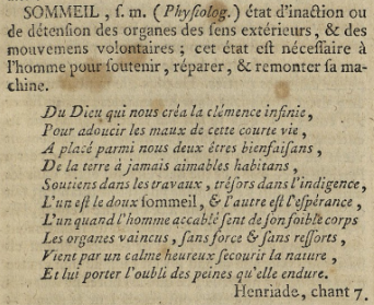 Publié dans le volume XV (1765), l’article fait partie d’un ensemble qui comprend aussi SOMME, SOMMEIL, (Gram. & Synonym.) et Sommeil (Mythol.). Jaucourt et ses secrétaires traitent le thème du sommeil dans ses dimensions lexicale, mythologique et physiologique, cette dernière donnant lieu à l’article le plus long, le seul qui sera réécrit dans les suites de l’Encyclopédie. Issu d’un ample couper-coller, l’article n'est pourtant pas de pure compilation. Il résulte en réalité d’un travail subtil, informé par un demi-siècle de débats savants et de polémiques autour de l'épineuse question médicale du sommeil.
